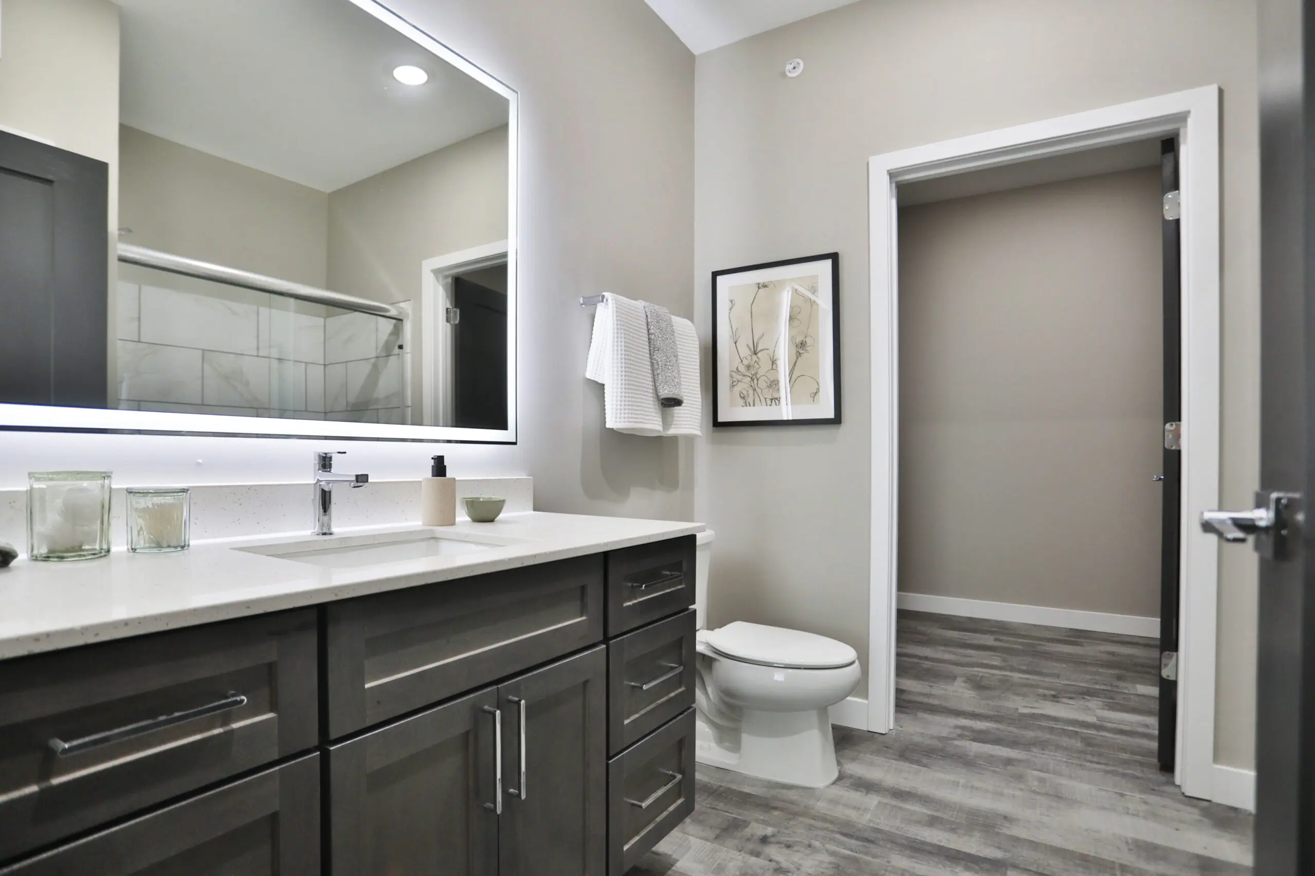 Master bathroom with quartz countertops, large lit mirror and tiled shower at Altair Apartments in Florence, KY