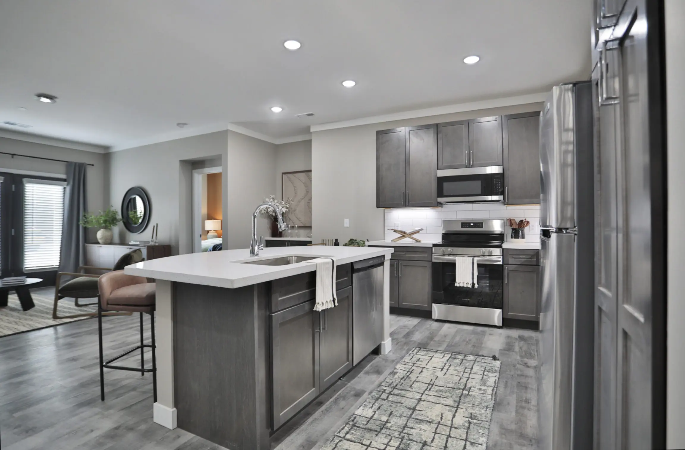 kitchen area at Altair Apartments in Florence, KY. Living space near by. Wooden, plank floors, stove and microwave. Quartz countertops.
