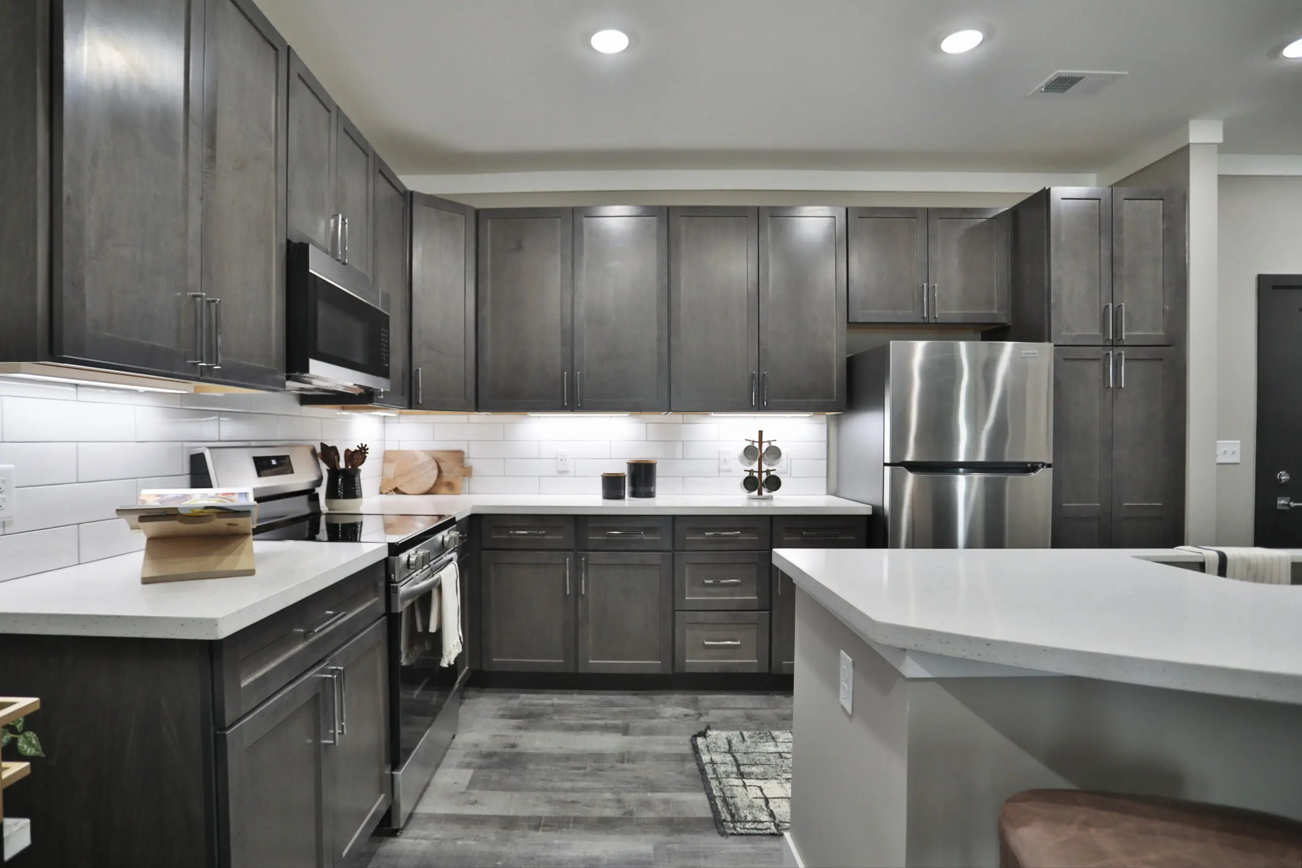 Altair Apartments in Florence, KY, view of stove and microwave. Quartz kitchen countertop, stainless steel frig