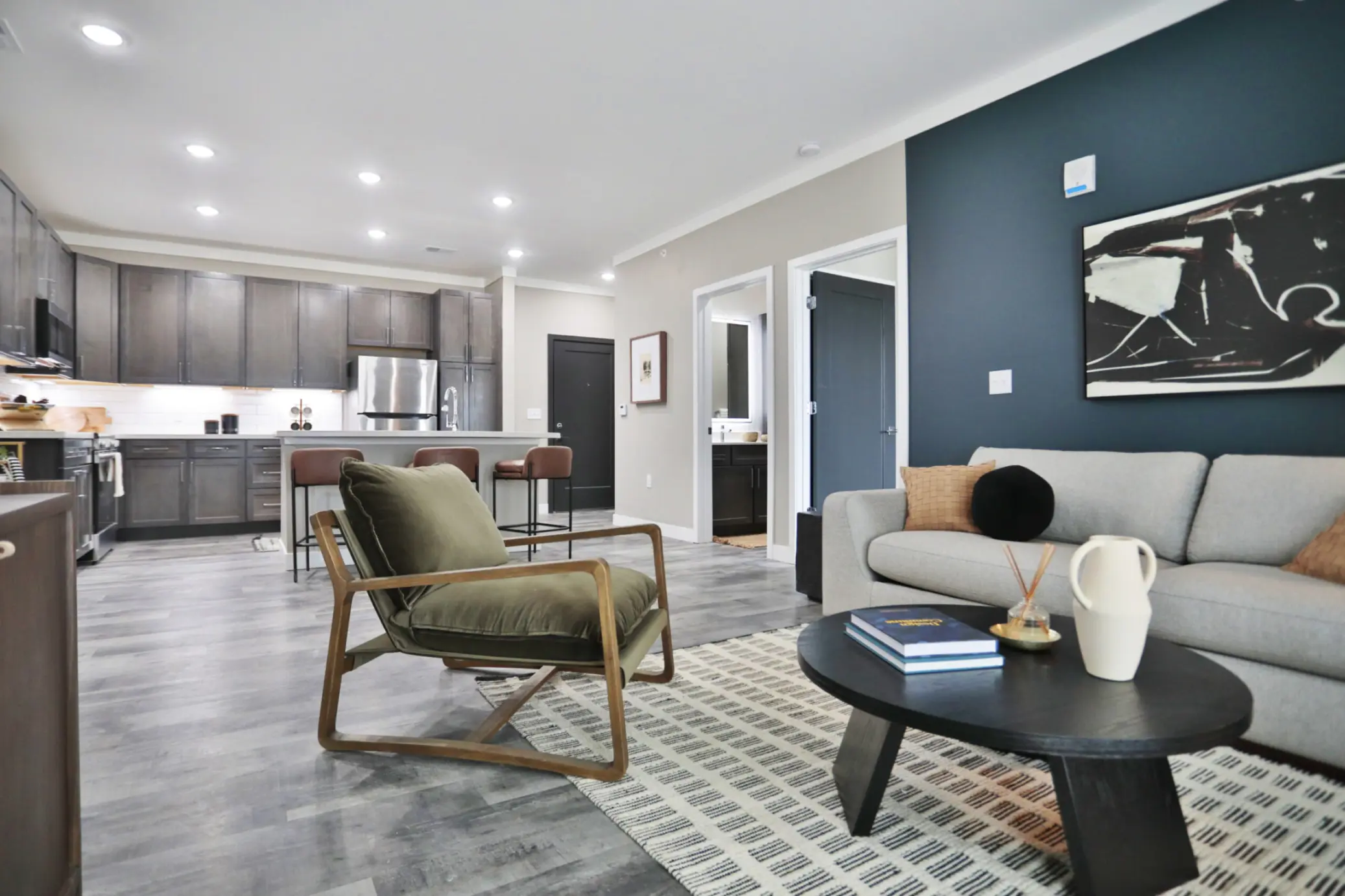Living room, luxury living space and view of kitchen area Altair Apartments in Florence, KY