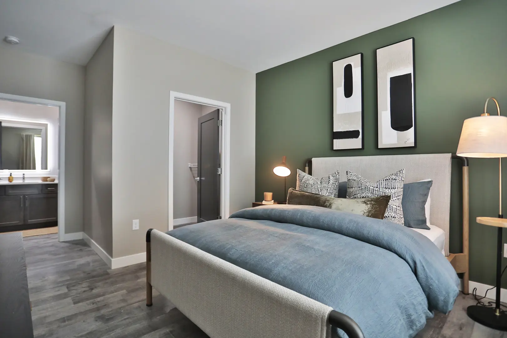 Master bedroom with wooden plank floors, green walls, large window and spacious area at Altair Apartments in Florence, KY