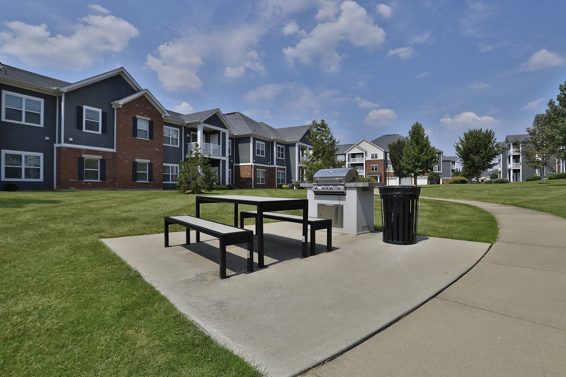 Courtyard grilling area at Kendal on Taylorsville with built-in grills, outdoor seating, and landscaped surroundings ideal for dining and gathering with neighbors.