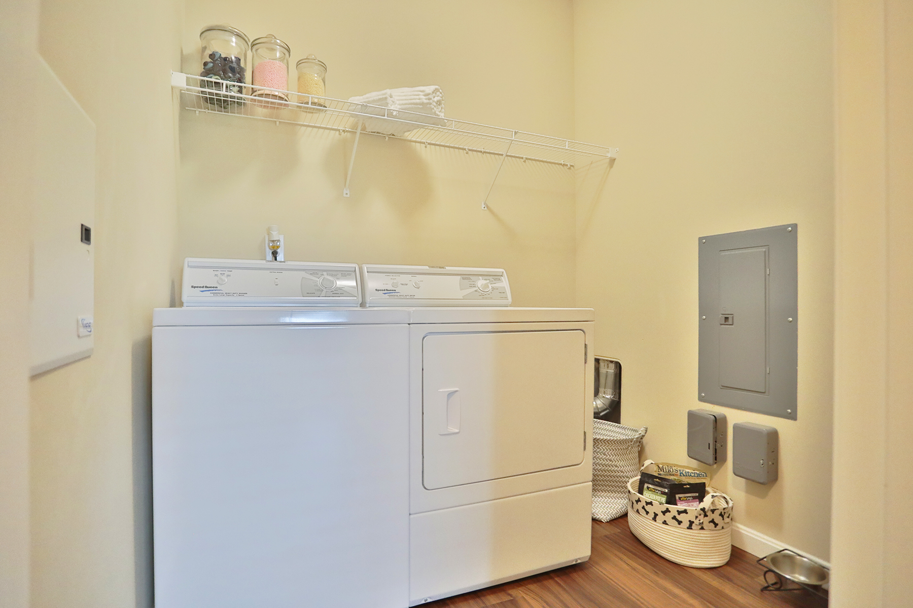 Utility room at Kendal on Taylorsville including a full-size washer and dryer with convenient shelving and storage.
