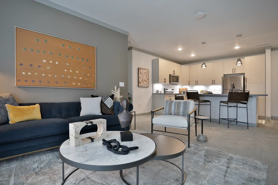 Kitchen and seated area at the clubhouse at Graphite Oakley in Cincinnati, OH
