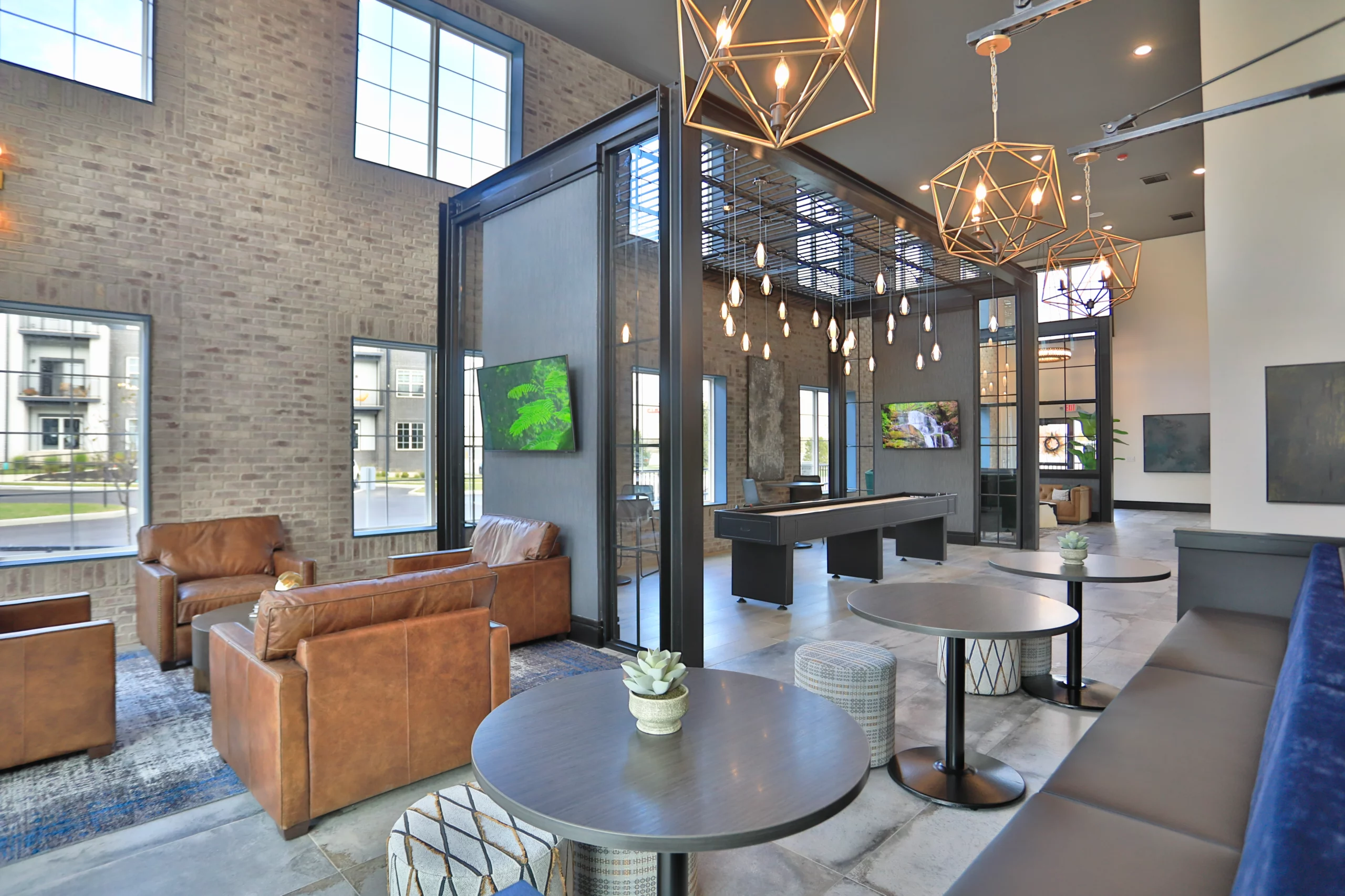 Clubhouse at Graphite Oakley in Cincinnati, OH. Leather chairs, table and tv.