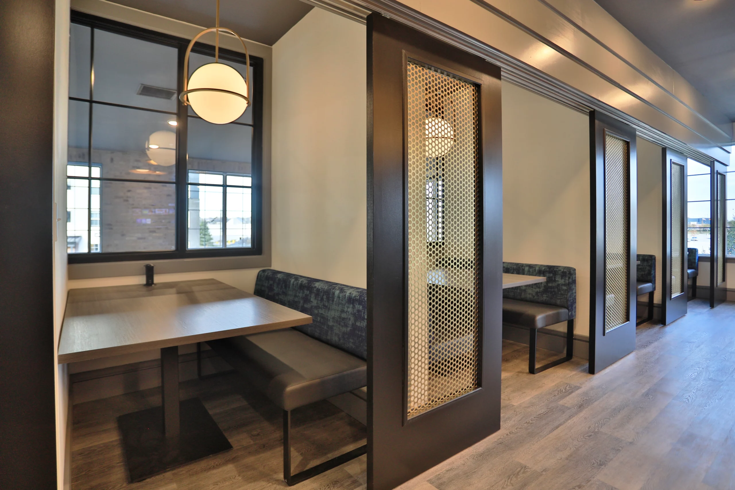Lounge area at Graphite Oakley in Cincinnati, OH. Retro, modern decor.