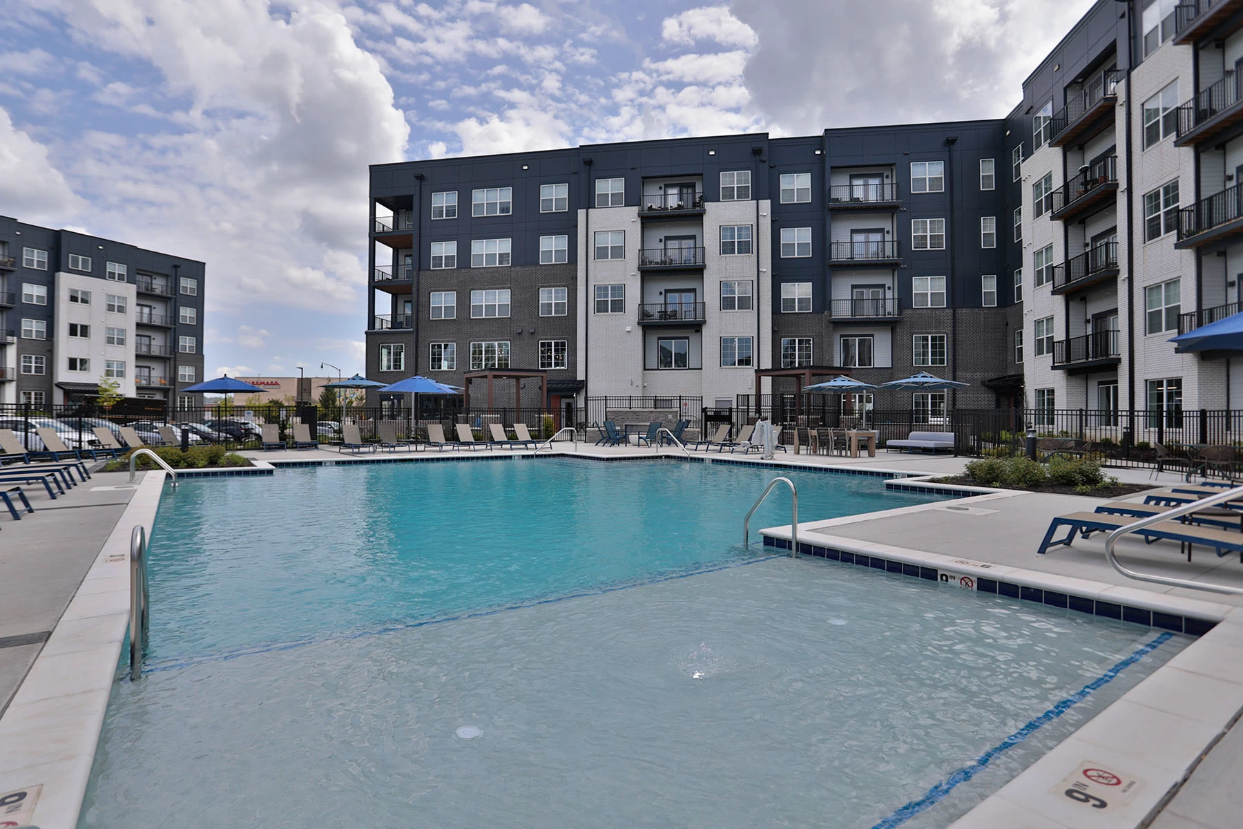 Graphite at Oakley pool and pool deck view of backside of apartments