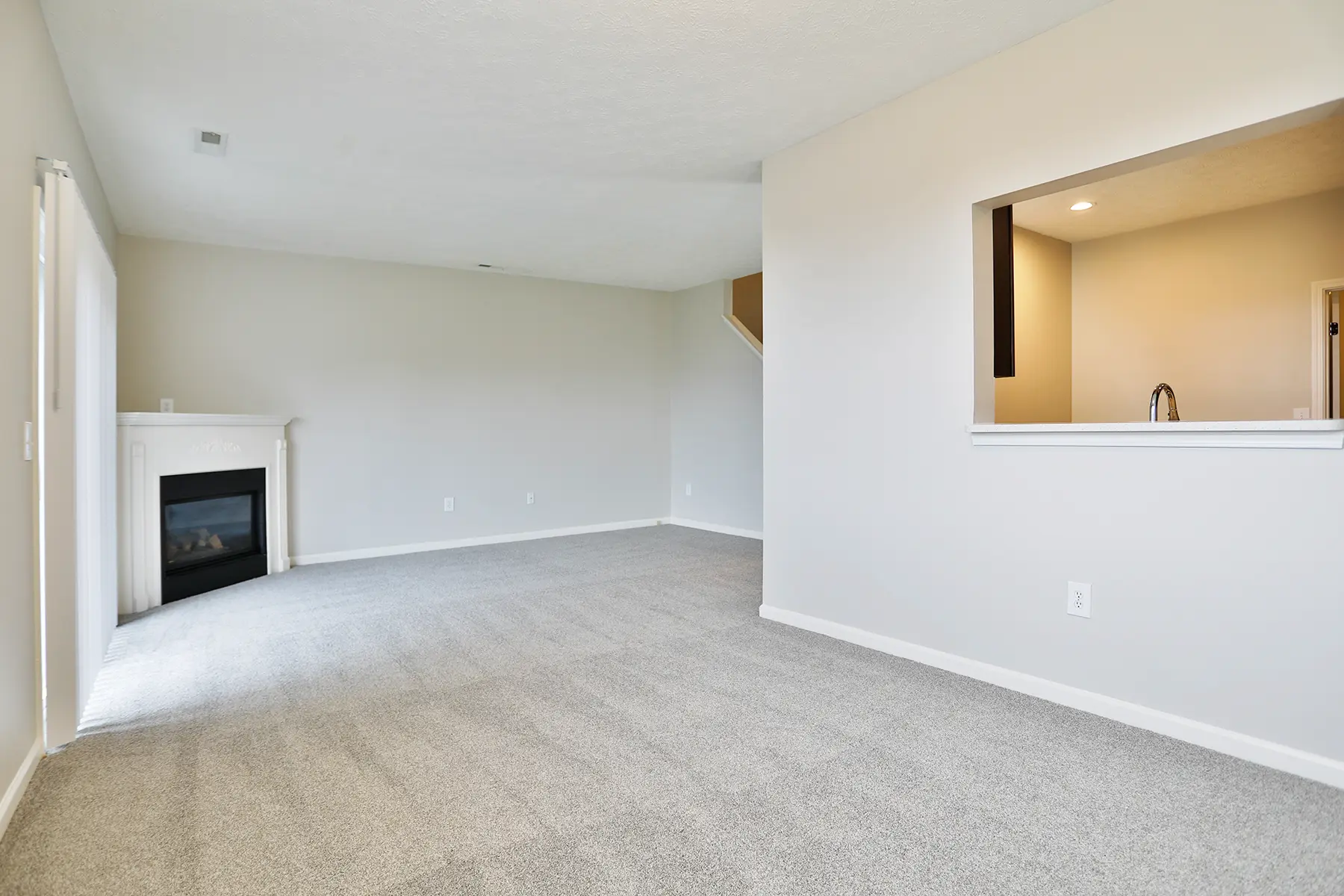 Empty floor plan at The Landings at Beckett Ridge. Spacious living space, fire place and opening to kitchen area