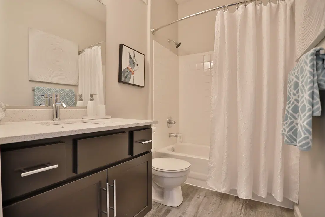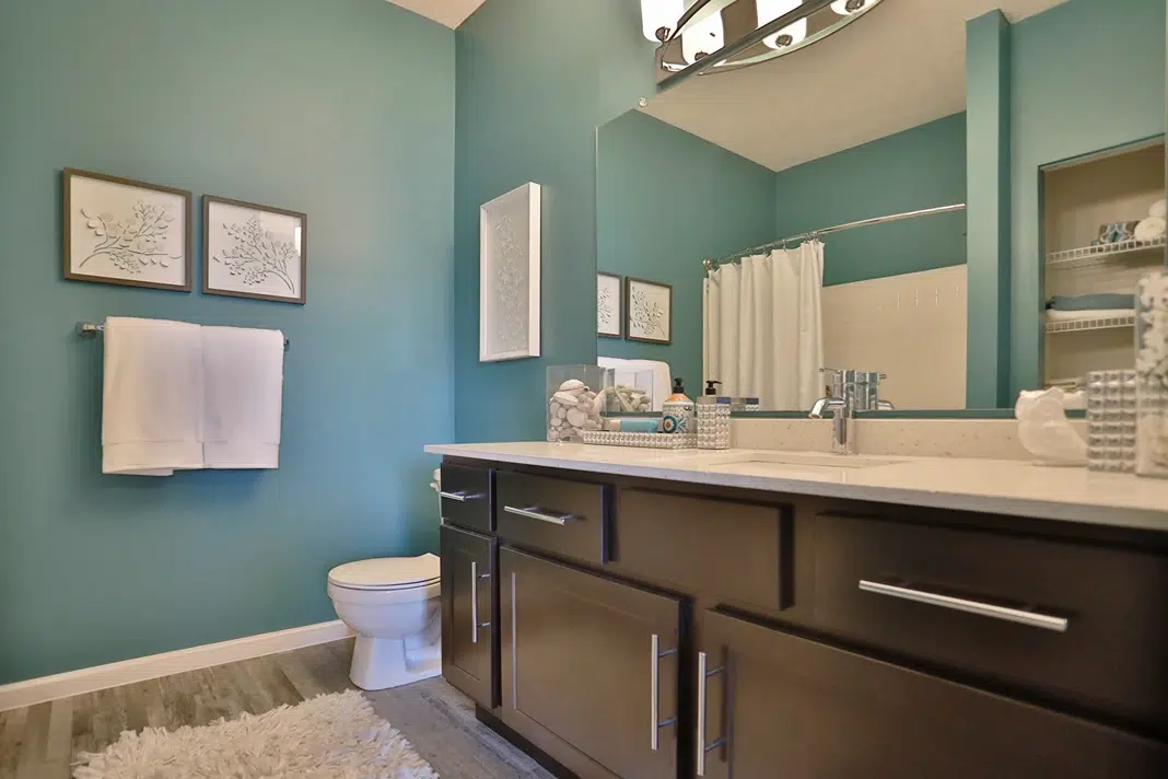 Bathroom at The Landings at Beckett Ridge. Two vanities, mirror and toilet
