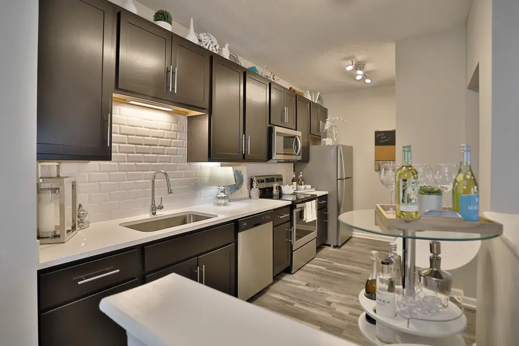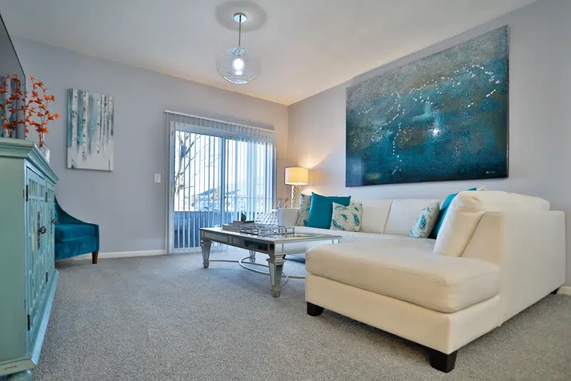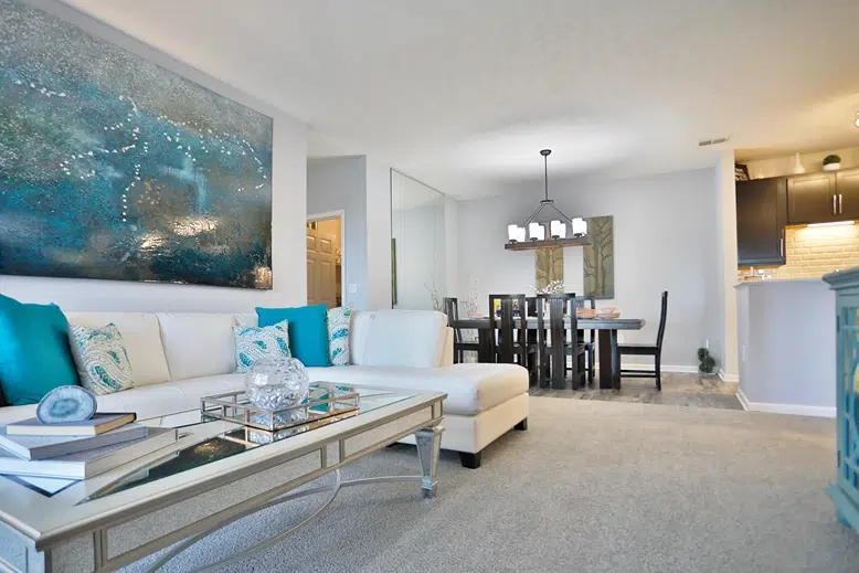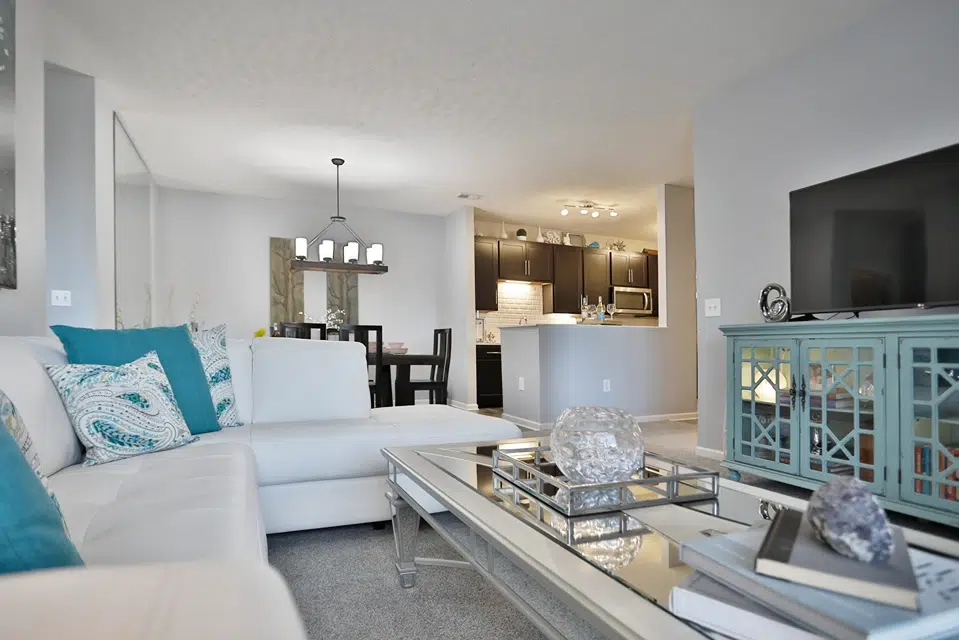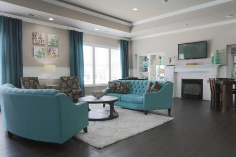 beautifully decorated clubhouse with kitchen area and seating for residents.